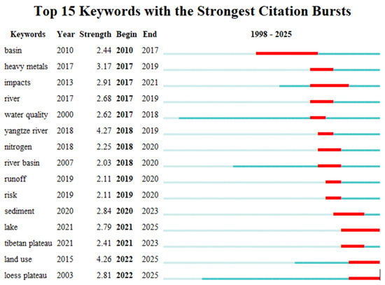 Bibliometric analysis reveals that the frontier dynamics of soil erosion and lake water environment research in China show significant policy-driven stage characteristics. The burst word analysis (Figure 5) showed that ‘yangtze river’ (Yangtze River Basin) ranked first with a burst intensity of 4.27 (2018–2019), followed by ‘land use’ (land use) and ‘heavy metals’ (heavy metals) with burst intensities of 4.26 and 3.17, respectively. A cluster cross analysis showed that these hotspots were highly associated with core clusters such as #0 ‘three gorges reservoir’ (Three Gorges Reservoir) and #3 ‘soil erosion’ (Figure 6).