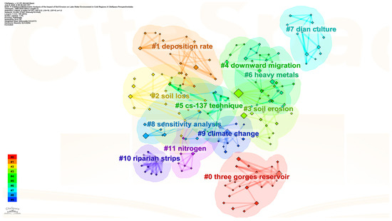 The cluster analysis of this study showed that ‘three gorges reservoir’ (Three Gorges Reservoir area), as the largest research cluster (contour value 0.812), contains 28 core keywords, which reflects the special position of this area in the study of soil erosion–lake system. The unique geographical location and hydrological conditions of the Three Gorges Reservoir area make it a ‘natural laboratory’ for studying the effects of soil erosion on large artificial lakes [23]. The keyword co-occurrence network showed that the cluster mainly focused on the three dimensions of ‘sediment’, ‘heavy metals’ and ‘water quality’, revealing the change of research focus from simple water regulation to water quality-sediment-ecosystem comprehensive research [8].