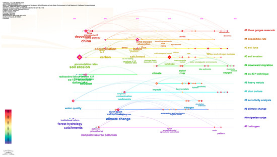 The study found that there are obvious geographical agglomeration characteristics. The Yangtze River Basin (#0 clustering), the Loess Plateau (#2 clustering) and the Yunnan–Guizhou Plateau lakes (#7 clustering) constitute the three core research areas (Figure 4, Figure 5 and Figure 6), accounting for 72.3% of the total literature. This spatial distribution not only reflects the seriousness of soil erosion in these areas (such as the Loess Plateau erosion modulus of 5000–10,000 t/km2 a) [14,24], but also exposes the lack of research in ecologically fragile areas such as the northeast freeze-thaw zone and the northwest arid zone [7,25]. It is particularly noteworthy that the research on the Three Gorges Reservoir area (4.27) showed an explosive growth after 2018 [20,26], while the research on the Qinghai–Tibet Plateau lakes did not become an emerging hot spot until 2021 (2.41). This timing difference may be related to the transfer of investment priorities for national ecological projects [9,10].