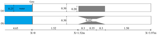 A Computational Fluid Dynamics (CFD) model was applied to simulate the three-dimensional flow dynamics of the problem. The reference model of this study was adapted from the experiment work of Kocaman et al. [19]. As illustrated in Figure 1, the setup consists of a rectangular channel with a width of 30 cm and a zero-bed slope. At t = 0 (t is time), a still water region with a height of 25 cm exists upstream of the gate’s location. The gate has not been modeled. The simulation begins with the sudden releasing of initial water, initiating an unsteady flow downstream while the water upstream gradually drained over time. Throughout this drainage process, no additional inflow is introduced into the computational domain. Downstream of the gate’s initial position (set as the origin coordinates system), two converging transitions with a trapezoidal shape in plan are present, significantly influencing the characteristics of the unsteady flow.