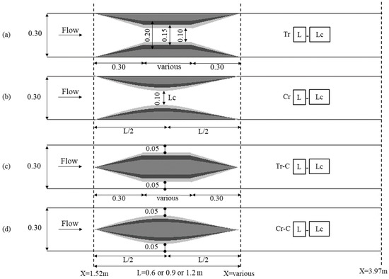 Plan view of the channel contractions used in the numerical simulations of the present study (all dimensions are in meters): (a) parallel lateral contraction with trapezoidal shape, (b) parallel lateral contraction with crescent shape, (c) parallel mid-width contraction with trapezoidal shape, (d) parallel mid-width contraction with crescent shape.
