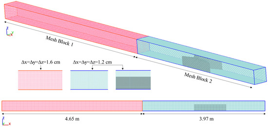 Three closure models, namely, the standard k-ε [44], the RNG k-ε [45], and the standard k-ω [46], were adopted to complete solving the RANS equations, and accuracies of them are compared in Section 2.4.2. All of these two-equation models have widespread use in dam-break problems in channels [19,32,35,40,41,42,47,48]. And of course, these are the available two-equation closure models for RANS equations in FLOW-3D software. The numerical model employs the Volume of Fluid (VOF) method, introduced by Hirt and Nichols [49], to track the free surface of the flow. Additionally, the Fractional Area/Volume Obstacle Representation (FAVOR) algorithm, proposed by Hirt and Sicilian [50], was implemented to approximate solid boundaries within the computational domain.