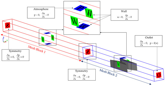 This CFD simulation demonstrates satisfactory performance in solving hydraulic problems involving both steady and unsteady flow in open channels, as validated in previous studies [19,30,38,39,40,41]. In this study, Reynolds-Averaged Navier–Stokes (RANS) equations were incorporated to solve the three-dimensional turbulent flow of an incompressible Newtonian fluid. In previous dam-break problems, the RANS approach provides a more accurate results compared to Shallow-Water Equations (SWE), especially in terms of the initial times of dam-break, and moreover provides better insights of the three-dimensional flow field around the obstacles [19,35,40,42,43]. On the other hand, the RANS approach is considered cost-effective in comparison with the Large Eddy Simulation (LES) method in terms of modeling turbulence. The conservation of mass and momentum equations are represented in three-orthogonal cartesian coordinates as Equations (1) and (2), respectively, in which they are discretized by the Finite Volume Method (FVM):