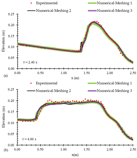 The validation and verification of the numerical model results were performed using water elevation data from the experiment conducted by Kocaman et al. [19]. The reason for choosing this parameter was the quantitative outputs that are needed for the current work. The meshing and accuracy of the numerical model should be sufficient to calculate the water level. In this process, the flow profiles were extracted within the range of 0 to 2.5 m downstream of the gate position at times 2.40 s, 4 s, and 5.50 s. Additionally, time-history water elevations at points p1, p3, and p5 were obtained. The verification process was carried out in three stages, as detailed in Section 2.4.1, Section 2.4.2 and Section 2.4.3.