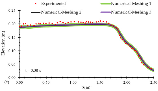 Flow profiles calculated by numerical models with different mesh sizes, compared to the experimental data of Kocaman et al. [19], at times of (a) t = 2.40 s, (b) t = 4.00 s, and (c) t = 5.50 s after the gate removal.