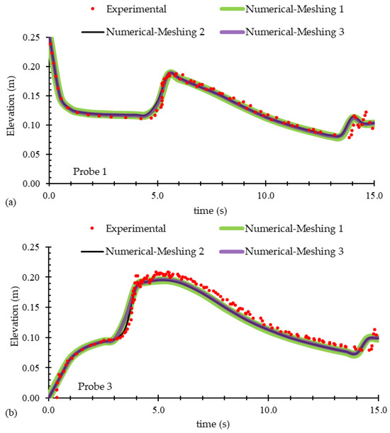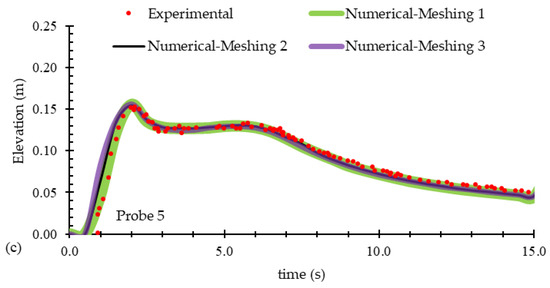 Time-history water elevations calculated by numerical models with different mesh sizes, compared to the experimental data of Kocaman et al. [19], at three locations of (a) Probe 1, (b) Probe 3, and (c) Probe 5, as described in Figure 5.