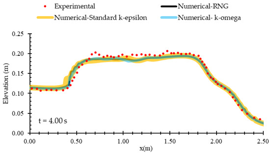 After adopting the optimal mesh, the reference model was applied to the three turbulence models: RNG, standard k-ε, and k-ω, to determine the most suitable model. To assess the accuracy of each one, flow profiles were evaluated at three time points: 2.40 s, 4.00 s, and 5.50 s. Figure 8 presents the result of the flow profile analysis at 4 s. The graphs of all three turbulence models show negligible difference, indicating that water elevation parameter was not sensitive to the choice of turbulence model in this problem. Considering the satisfactory performance of the RNG turbulence model in estimating a wide range of hydrodynamic parameters in hydraulic structure problems, specifically in dam-break simulations containing water–structure interactions [23,38,51,52,53,54,55,56,57], this model was selected for the numerical simulations in the present study.