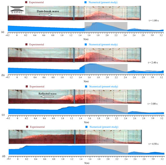 Flow profiles for the reference case (present study) and experimental data [19] at times of (a) t = 1.80 s, (b) t = 2.40 s, (c) t = 3.00 s, and (d) t = 4.50 s after the gate removal.