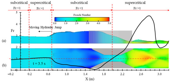 Variation of the Froude number along the channel at the time of 3.5 s after the gate removal for the reference case: (a) sideview (across the channel’s centerline); (b) plan view.