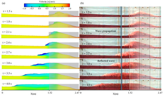 The changes in the flow velocity at various times are demonstrated in the contours of Figure 11. The propagation state of the main flow as well as the hydraulic jump have reliable conformity with experimental results of Kocaman et al. [19]. At times 1.5, 1.8, and 2.1 s, the flow velocity at the transition site decreased. After 2.4 s, in the regions affected by the hydraulic jump, flow bifurcation became apparent, where the deeper parts of the flow exhibited a positive velocity (downstream direction) while the upper parts showed a negative velocity (upstream direction). Over time, the upper wave propagated upstream, and its speed gradually decreased. However, in the area affected by the reflected wave, the velocity of the main flow downstream decreased compared to the approaching flow due to the hydraulic jump. Upstream of the hydraulic jump, the velocity remained greater than 1.0 m/s in all cases. However, downstream of the hydraulic jump, the main flow velocity reduced to approximately 0.5 m/s. Meanwhile, the propagation velocity of the hydraulic jump (the upper wave velocity) initially reached a maximum of about −1 m/s and averaged around −0.5 m/s over time.