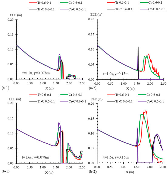Flow profiles for cases with different transition shapes, including Tr 0.6–0.1, Cr 0.6–0.1, Tr-C 0.6–0.1, and Cr-C 0.6–0.1, alongside the channel’s mid-width (y = 0.15 m) and quarter-width (y = 0.078 m) and at times of (a) t = 1.0 s, (b) t = 1.6 s, (c) t = 2.0 s, (d) t = 3.0 s, and (e) t = 5.0 s after the gate removal.