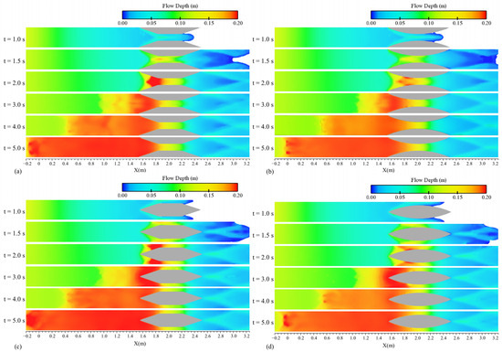 The flow profiles for the reference numerical run (as described in Figure 1) are plotted in Figure 9. As time progressed from the start of the event (the sudden removal of the gate), the dam-break wave reached the transition location, causing the water elevation increase at the converging point, as seen in Figure 9a. This increase in water elevation propagated upstream over time as a reflected wave, as observed in Figure 9b–d. It can be inferred that a hydraulic jump occurred at the transition point due to the collision between the high-velocity main flow and the slower-moving fluid. The formation of this initial hydraulic jump reduced the velocity and increased the water elevation upstream of the transition. Frequently, as the flow encountered upstream currents with low-velocity zones, hydraulic jumps were repeated. The position of this hydraulic jump shifted over time and moved upstream. The occurrence of a moving hydraulic jump was also evident in the Froude number contours presented in Figure 10. The Froude number in a vertical axis is defined as Fr = u. (g.h)−0.5, where u is the flow depth-averaged velocity at x direction, h is the average flow depth at corresponding axis, and g is gravitational acceleration. The flow coming from upstream initially had a Froude number greater than 1.0 and is considered supercritical. In open channels, for an approaching flow having a certain specific energy (h + v2/2g, where h is the flow depth and u is the flow velocity), the maximum discharge is achieved when the flow experiences the critical depth. When a supercritical flow encounters a narrower section, the flow depth across the transition increases, unless it reaches the critical depth. In that case, chocking occurs, and the water is repelled to gain the specific energy required to pass through the constriction at the critical depth. As a result, a hydraulic jump occurs, and the inflow changes from a supercritical state to a subcritical state [58]. This fact justifies the formation of the hydraulic jump during the initial times of collision between the incoming dam-break wave and the contractions shown in Figure 9, which can also be concluded in Figure 10 by observing the Froude number variations. Overall, the observation of the hydraulic response of a dam-break wave crossing the contraction align well with the experimental results of Kocaman et al. [19]. The response factors include time of flow choking and formation of hydraulic jump, water elevation rise at choking time, the reflected wave elevation, and the upstream propagation pattern of the reflected wave, which are obvious in Figure 9.