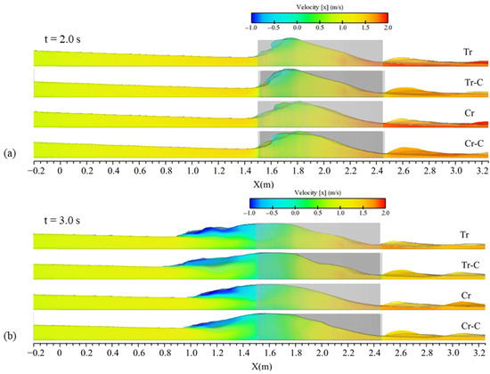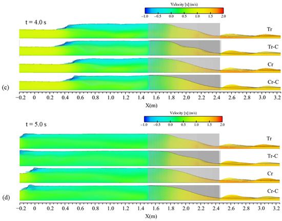 In addition, the propagation of the wave alongside the velocity field in the central plane of the channel are presented in Figure 14 for four tested shapes of contraction with L = 0.95 m and Lc = 0.1 m. The propagation patterns complied with observations of the flow profiles and water elevation contours. In the area affected by the moving hydraulic jump, the flow bifurcation was observed for all tested conditions, where the upper flow layer had negative velocity and the lower part had positive velocity with small values, but there was not a significant pattern in comparing the concentrations of the two velocity zones between the four examined cases. The quantitative velocity interval of the reflected wave and also the main wave in the bottom in all subfigures of Figure 14 were similar for the four examined contractions, and the only difference was the propagation pattern. Faster propagation of the upstream wave in the cases of Tr and Tr-C was related to higher water elevations in t = 2.0 s (initial times as Figure 14a), as mentioned before. It is noticeable that at t = 2.0 s (Figure 14a), the flow exiting the contractions Tr and Cr had relatively larger velocity than the cases of Tr-C and Cr-C, because the water flowed downstream from the middle of the channel in the cases of Tr and Cr, not being obstructed by contractions.