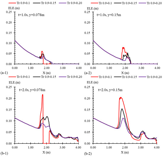 Flow profiles for three cases including trapezoidal transitions of equal length (L = 0.9 m) but varying widths are presented in Figure 15. These profiles were observed along the central axis of the channel (y = 0.15 m) and a lateral axis at a quarter of the channel width (y = 0.078 m). The transitions were located between x = 1.52 m and x = 2.42 m. For the conditions tested, the channel widths at the transition point (Lc) were 0.1 m, 0.15 m, and 0.2 m corresponding to 33%, 50%, and 66% of the total channel width. The flow lines passing through the central axis (y = 0.15 m) did not encounter any of the transitions, while those passing through the lateral axis (y = 0.078 m (interacted with the Tr 0.9–0.1 transition. As a result, in a section of the channel that overlapped with the contraction, the water elevation was zero. From the initial seconds (t = 1.0 s and t = 2.0 s in Figure 15a,b), it was evident that greater contractions resulted in an increase in water elevation. The wave’s peak generated by the flow interacting with the transitions varied significantly across the different contraction conditions. At t = 2.0 s (Figure 15a), the wave’s peak at the central axis for the Tr 0.9–0.1 case was 20 cm. In contrast, for the Tr 0.9–0.15 and Tr 0.9–0.2 cases, these values decreased to 15 cm and 11 cm, respectively. This indicates that the transition with a larger contraction had a more significant effect on the water elevation. The streamlines passing through the larger contraction underwent a more substantial change in direction, resulting in greater energy dissipation and a higher accumulation of water entering the contraction. As a result, the water elevation increased. At t = 5.0 s (Figure 15c), the reflected waves in all three scenarios propagated upstream in a unidirectional pattern. The upstream water level in the case of Tr 0.9–0.1 reached 20 cm, whereas for the Tr 0.9–0.15 and Tr 0.9–0.2 cases, it decreased to 18 cm and 16 cm, respectively, at the central axis. In addition to the differences in the water elevation, the position of the wave front also varied among the three tested scenarios. At t = 5.0 s (Figure 15c), the wave fronts for the Tr 0.9–0.1, Tr 0.9–0.15, and Tr 0.9–0.2 cases were positioned approximately before the gate, 0.5 m downstream, and 1.1 m downstream of the gate, respectively. This indicates that the reflected wave formed by the dam-break flow encountering a more compact contraction travelled faster upstream, which resulted from larger water elevations at the entrance of the contraction at the initial times (t = 2.0 s). On the downstream side of the channel contraction (x > 2.47 m), the flow profiles followed a distinct pattern, as illustrated in Figure 15. In the initial seconds (t = 1.0 s and t = 2.0 s in Figure 15a,b), the flow profiles showed minimal variation, but over time, at t = 5.0 s, as shown in Figure 15c, the profiles diverged. At this point, the average water elevation downstream of the Tr 0.9–0.1 transition was 4 cm at axis y = 0.078 m, while downstream of Tr 0.9–0.15 and Tr 0.9–0.2 transitions, the average water elevations were 5 cm and 6 cm, respectively. Therefore, in contrast to the upstream reflected wave profile, the water elevation downstream of the transitions decreased as the contraction ratio increased.