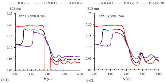 Flow profiles for three cases with various contraction widths including Tr 0.9–0.1, Tr 0.9–0.15, and Tr 0.9–0.2 alongside the channel’s mid-width (y = 0.15 m) and quarter-width (y = 0.078 m) and at times of (a) t = 1.0 s, (b) t = 2.0 s, and (c) t = 5.0 s after the gate removal.