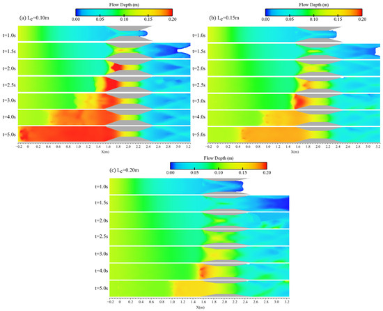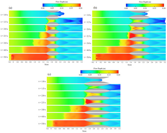 Flow profiles for three crescent-shaped transitions of varying lengths are depicted in Figure 18. In all cases, the channel width at the contraction section (Lc) remained constant at 0.15 m, while the transition lengths (L) were 0.6 m, 0.9 m, and 1.2 m. The flow lines passing through these transitions, both along the center axis of channel width (y = 0.15 m) and quarter-channel width (y = 0.078 m), did not directly interact with the transitions but rather passed in close proximity. Since all three transitions originated from the same position within the channel, the reflected waves within the first 2 s following gate failure (Figure 18a,b) had small differences in elevations, which was quite a bit higher for shorter transitions in the central axis. However, variations in the water elevation along the transition and downstream sections became more pronounced over time. By t = 5.0 s, as shown in Figure 18c, the reflected wave associated with Cr 0.6–0.15 advanced further upstream compared to Cr 0.9–0.15, showing a notable difference. Similarly, a comparable trend was observed for Cr 0.9–0.15 relative to Cr 1.2–0.15. The propagation of the hydraulic jump was linked to larger water elevations at the contraction site, which formed at the initial times. In the case of shorter contractions, the water elevations were slightly larger, contributing to a more pronounced reflection of the wave. Nonetheless, the differences in the reflected wave’s front remained subtle, and the water elevations remained nearly identical across all three cases. It is worth mentioning that at the contraction site, a notable increase in the water level was observed for the longer transition, which also influenced a greater longitudinal extent of the channel.