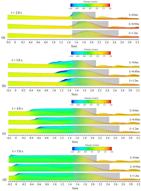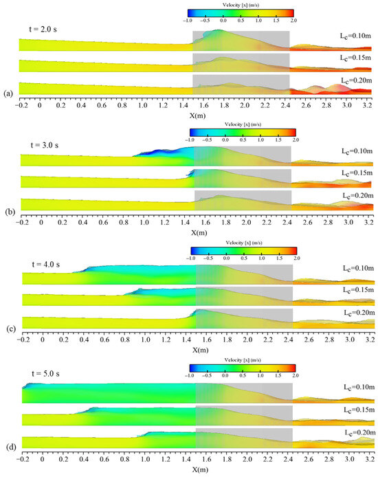 In addition, the propagation of the wave alongside the velocity field in the central plane of the channel is presented in Figure 20 for the same contractions with different lengths. The observed propagation patterns align with the results from the flow profiles and water elevation contours. In the region affected by the moving hydraulic jump, flow bifurcation was observed in all tested conditions, where the upper flow layer exhibited negative velocity and the lower part showed positive velocity with small magnitudes. However, there was no significant pattern when comparing the concentrations of the two velocity zones across the three examined cases. The quantitative velocity interval of the reflected wave and the main wave in the bottom in all subfigures of Figure 20 were almost similar for the three examined contractions, and the only difference was the propagation pattern. The faster propagation of the upstream wave in cases with shorter contractions was related to higher water elevations at t = 2.0 s as Figure 20a (initial times). This indicates that the shorter transitions resulted in a more rapid advance of the reflected wave due to the larger increase in water elevations in the earlier stages, which is justified in Figure 19.