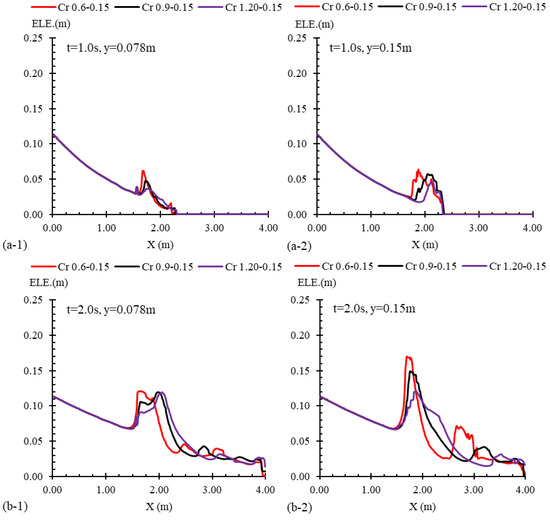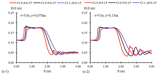 Flow profiles for three cases with varied transition lengths, namely, Cr 0.6–0.15, Cr 0.9–0.15, and Cr 1.2–0.15, alongside the channel’s mid-width (y = 0.15 m) and quarter-width (y = 0.078 m) and at times of (a) t = 1.0 s, (b) t = 2.0 s, and (c) t = 5.0 s after the gate removal.