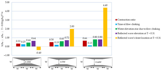 Among the examined parameters, contraction width emerged as the most influential in generating hydraulic response. Higher contraction ratios led to stronger wave reflections and more significant upstream effects. The observation of flow profiles and water elevation contours showed that for three contractions occupying 66%, 50%, and 33% of the channel width (namely, Tr 0.9–0.1, Tr 0.9–0.15, and Tr 0.9–0.2, as described in Figure 2), dam-break flow crossing the transition choked at about t = 2.0 s, t = 3.0 s, and t = 4.0 s after the gate (dam) removal, respectively; meanwhile, the water elevations rose up to 20 cm, 15 cm, and 11 cm at the contraction site, respectively. By the formation of hydraulic jump and the reflected wave, the water elevation upstream of the contractions reached 20 cm, 18 cm, and 16 cm, respectively, for these cases at t = 5.0 s. These values for water elevations were extremely noticeable compared with the initial reservoir level (h0 = 25 cm). Additionally, observations on velocity contours in all the investigated cases indicated that in the area affected by hydraulic jump, flow bifurcation was evident where the upper flow layer had negative velocity (up to −1 m/s) and the bottom layer had positive velocity that was reduced due to being covered by hydraulic jump. Between the investigated cases, there was no significant difference between the velocity interval of the main flow or the reflected wave’s velocity. The main difference was the location of the upstream wave’s front at various times. At t = 5.0 s, the reflected wave fronts were positioned at x = −0.1 m, x = 0.5 m, and x = 1.1 m for Tr 0.9–0.1, Tr 0.9–0.15, and Tr 0.9–0.2, respectively (where x was measured from the initial gate location downstream). This proves that at a certain time, hydraulic response of the interaction between the dam-break wave and the higher-ratio contraction affected more of the area upstream. These quantitative comparisons are represented in Figure 21, providing a better conclusion about the hydraulic response of a dam-break wave interacting with guide-banks with various compaction ratios. In the diagrams of Figure 21, the water elevation (h) as well as downstream distance from the gate (x) parameters became dimensionless by being divided into the initial reservoir level (h0 = 25 cm); also, the time (t) parameter was multiplied by 0.01(g/h0)0.5 to become dimensionless (T = 0.01(g/h0)0.5 × t, where g is gravitational acceleration; for instance, T = 0.31 indicates the actual time of t = 5.0 s).