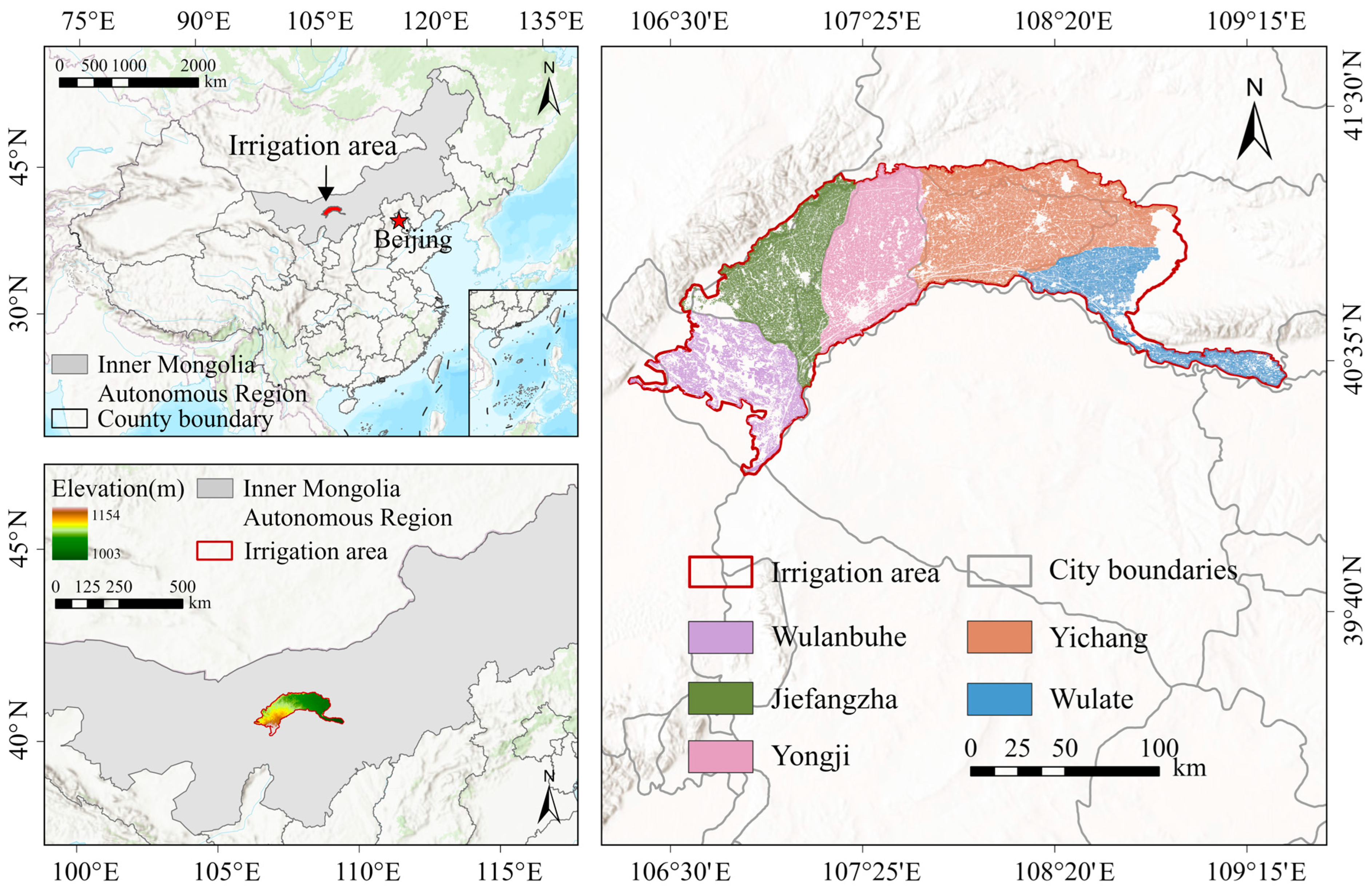 - Yin, J.; Li, X.; Engel, B.A.; Ding, J.; Xing, X.; Sun, S.; Wang, Y. Inter-regional food-water-income synergy through bi-level crop redistribution model coupled with virtual water: A case study of China’s hetao irrigation district. Water Resour. Res. 2024, 60, e2023WR036572. [Google Scholar] [CrossRef]