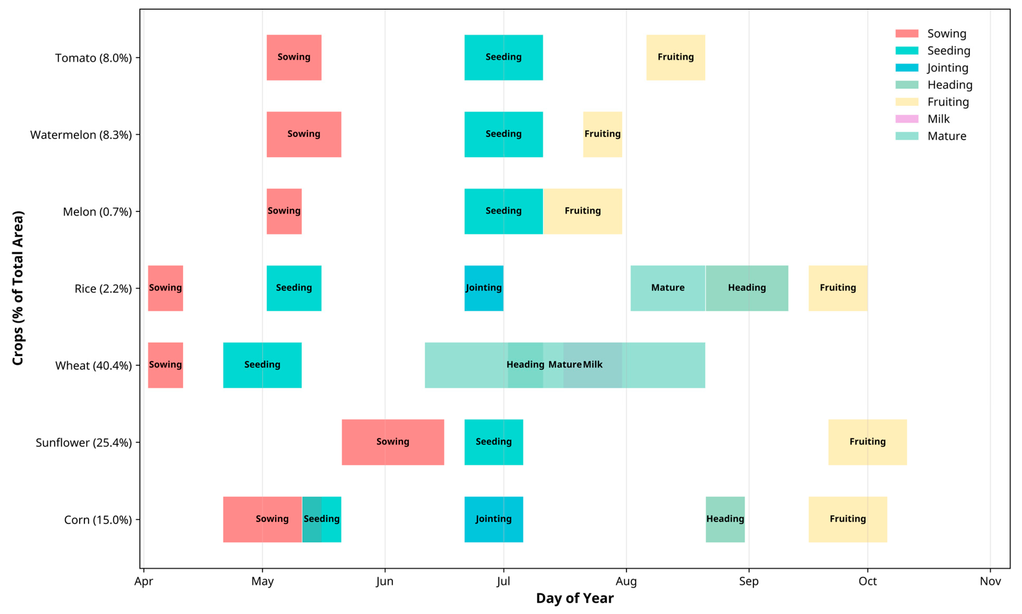 - Zhang, S.; Yang, L.; Ye, D.; Zhang, F.; Bai, Y.; Li, H.; Chen, J.; Fang, K. Extraction and dynamics of planting structure in Hetao Irrigation District of Inner Mongolia from 2000 to 2021 using deep learning. Trans. Chin. Soc. Agric. Eng. (Trans. CSAE) 2023, 39, 142–150. [Google Scholar]