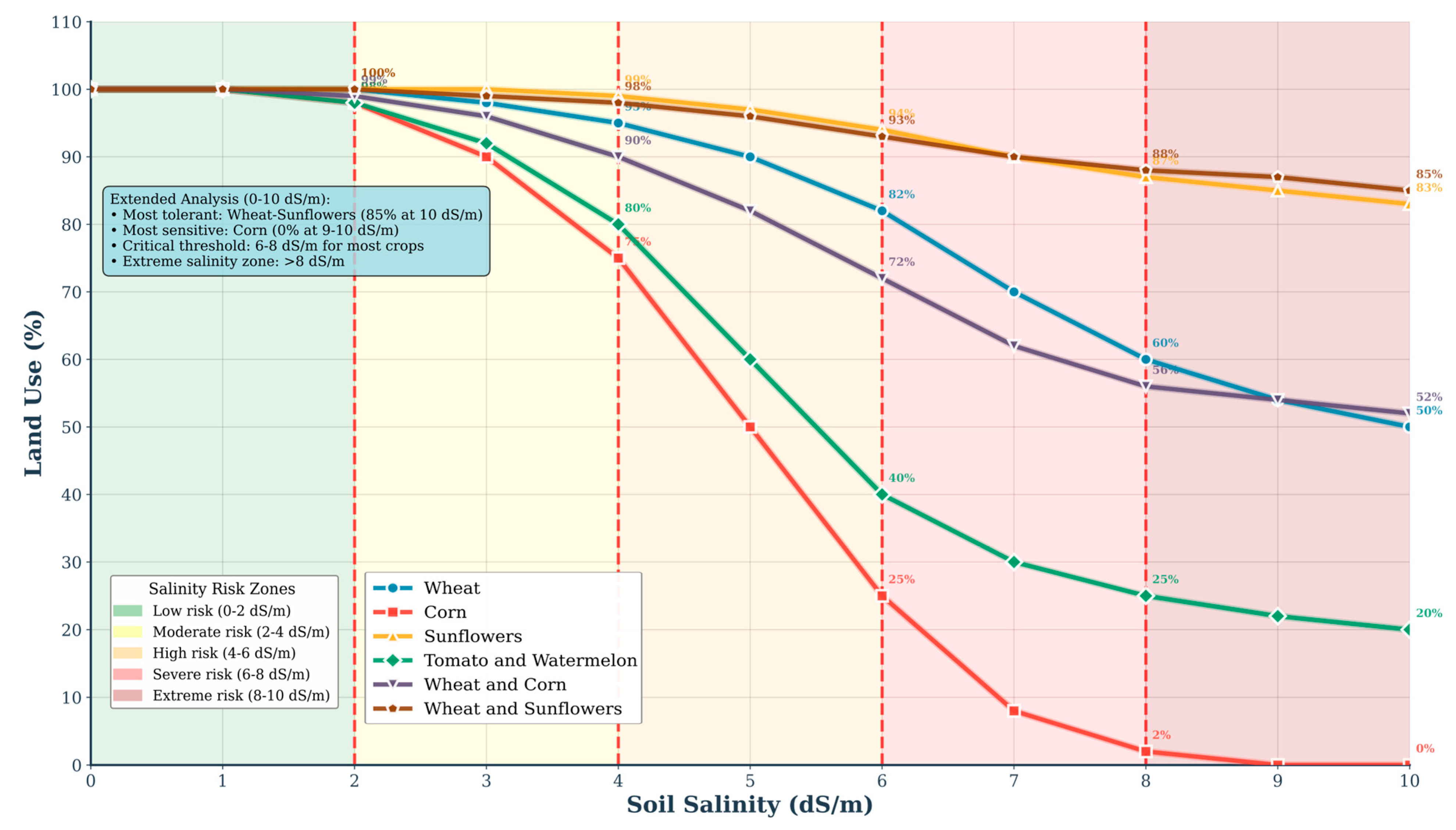 | Crop System | 90% Threshold (dS/m) | 75% Threshold (dS/m) | 50% Threshold (dS/m) | 25% Threshold (dS/m) | Final Land Use at 10 dS/m (%) | Decline Rate (%/dS/m) | Tolerance Rank | Tolerance Level |