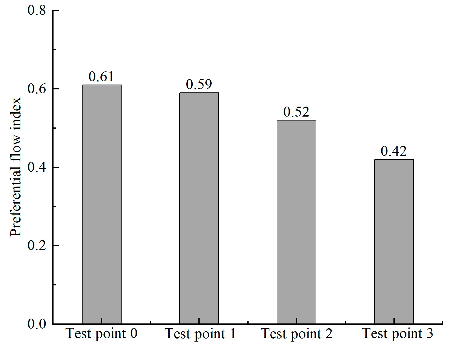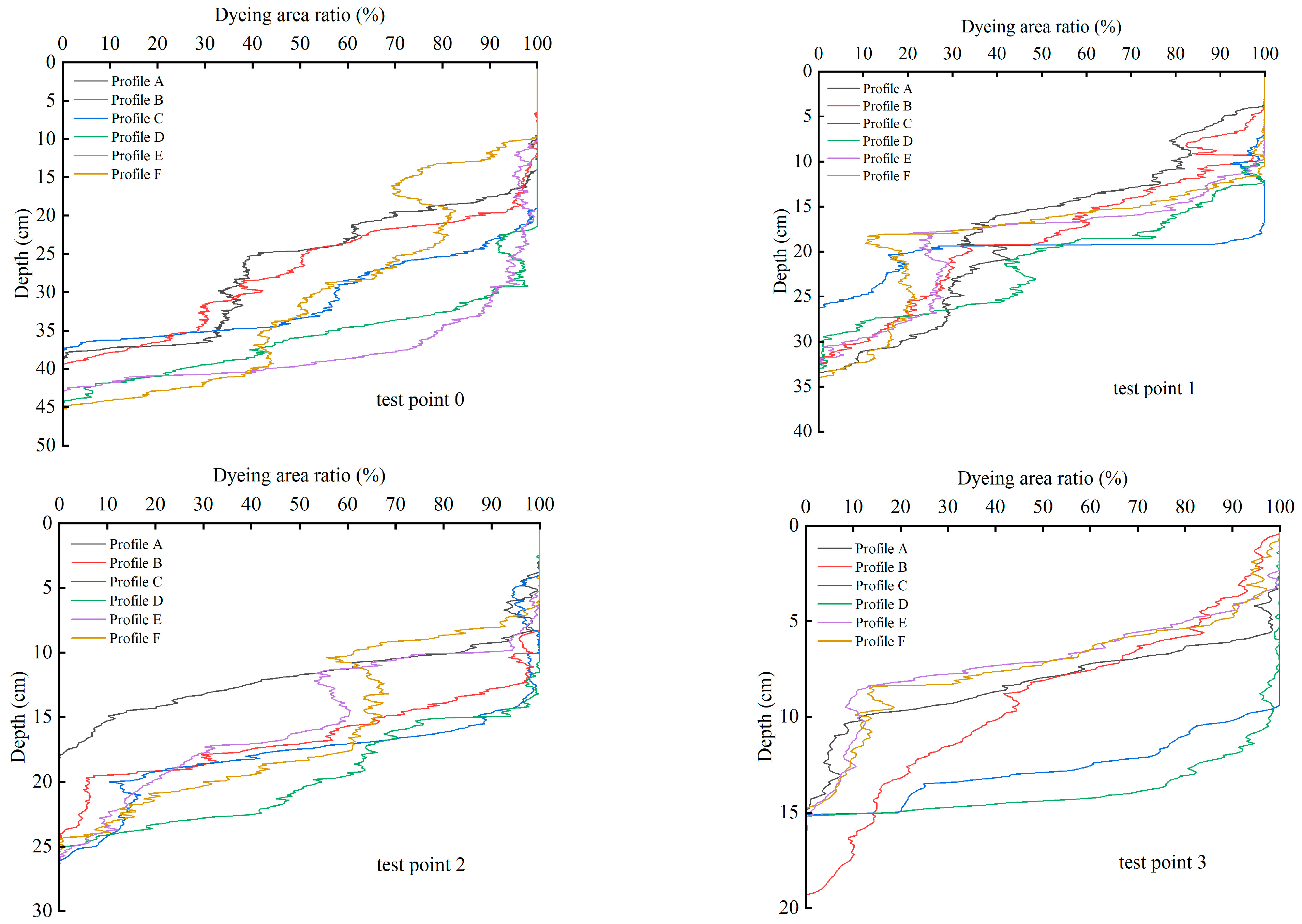 | Test Point | Substrate Flow Depth | Maximum Infiltration Depth | Preferential Flow Ratio | Length Index | Variation Coefficient of Stained Pattern |