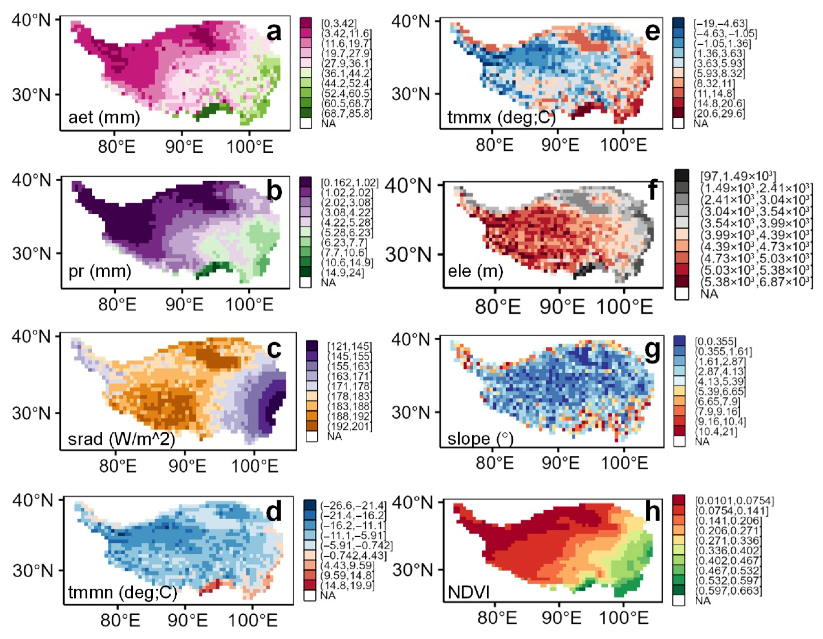 3.1. Spatial Variations in Climate, Topography, and Vegetation Across the Tibetan Plateau