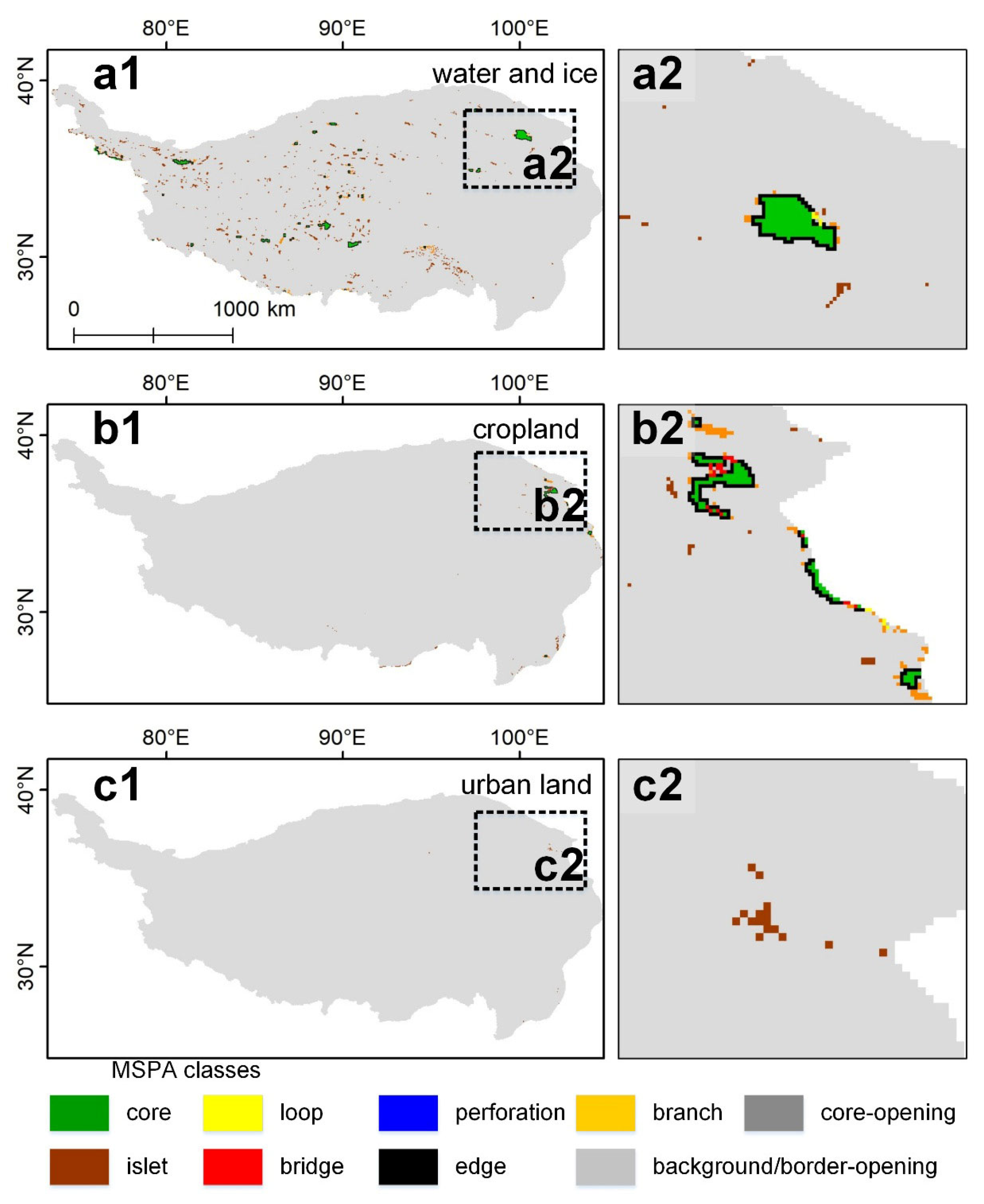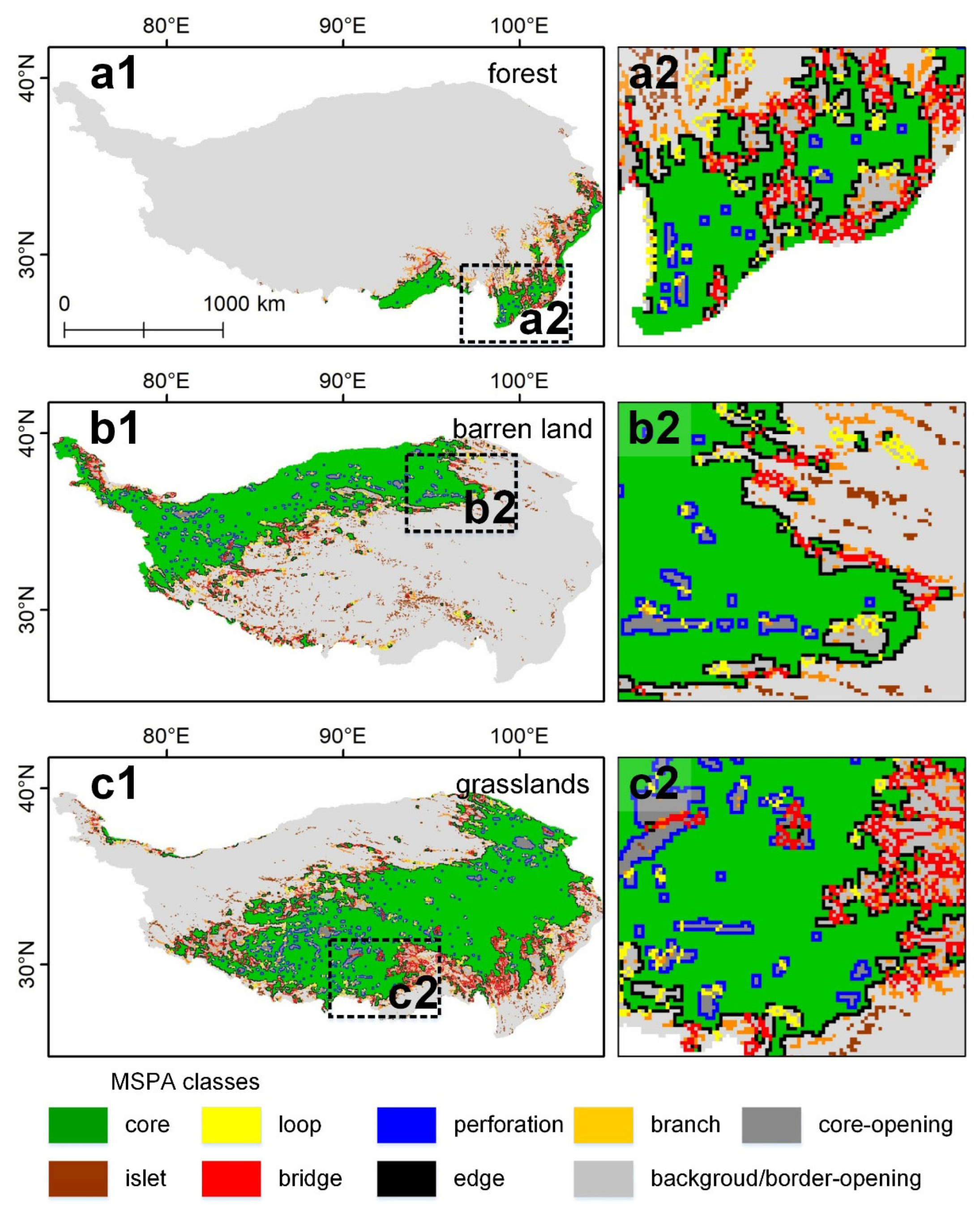 3.2. Spatial Variation in Landscape Morphology for Land Covers on the Tibetan Plateau
