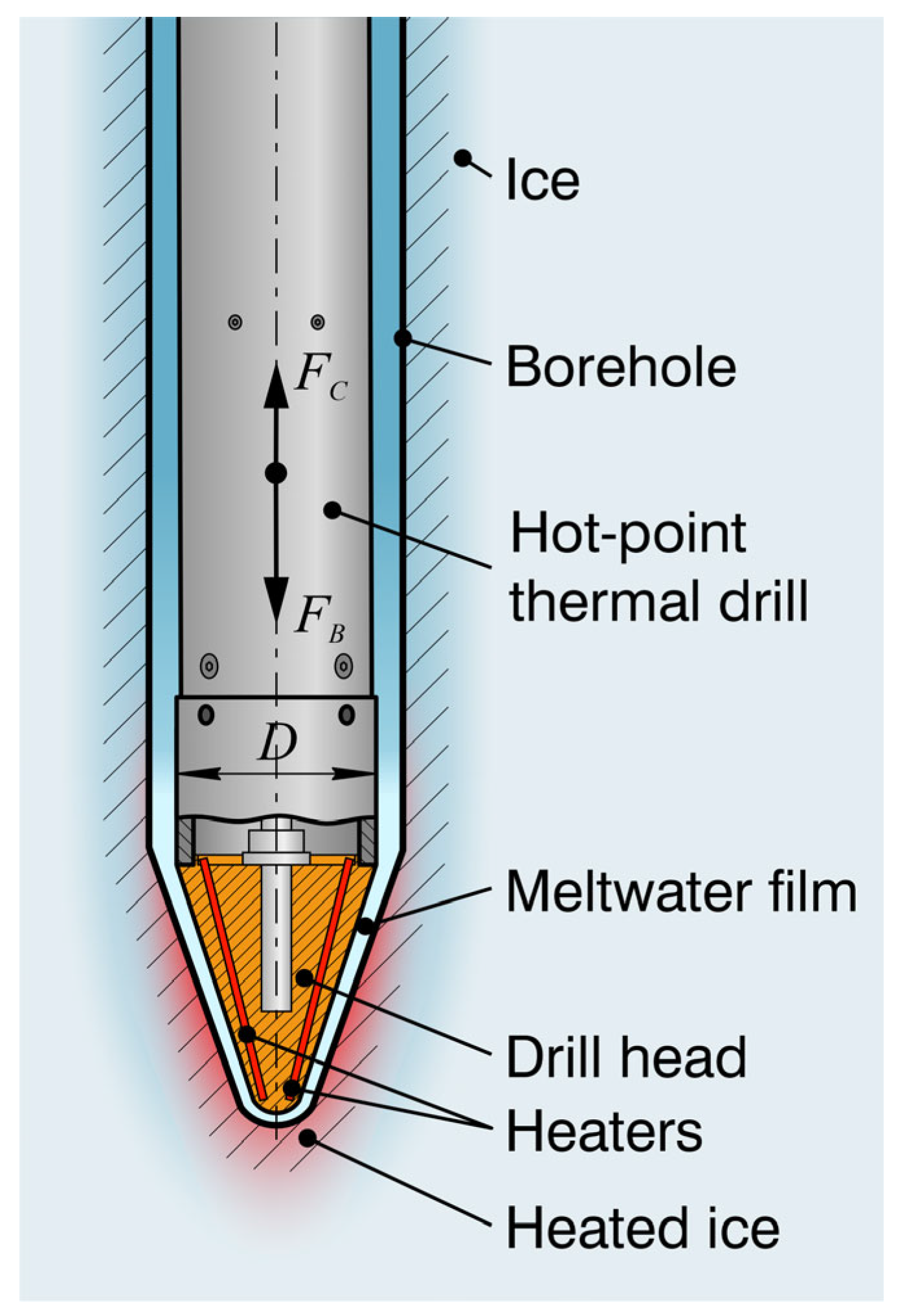 In the natural environment, ice takes various forms, including ice sheets, glaciers, icebergs, ground ice, river and lake ice, and sea ice. The majority (99.5%) of the permanent ice volume on Earth is locked up in ice sheets and glaciers which contain about 70% of Earth’s freshwater. One of the simplest ways to create holes in glaciers is by using thermal hot-point ice drills, also known as hot points, which have a heating element at the bottom to melt the ice. These drills are full-face (non-coring) drilling tools that can only produce meltwater and the borehole itself.