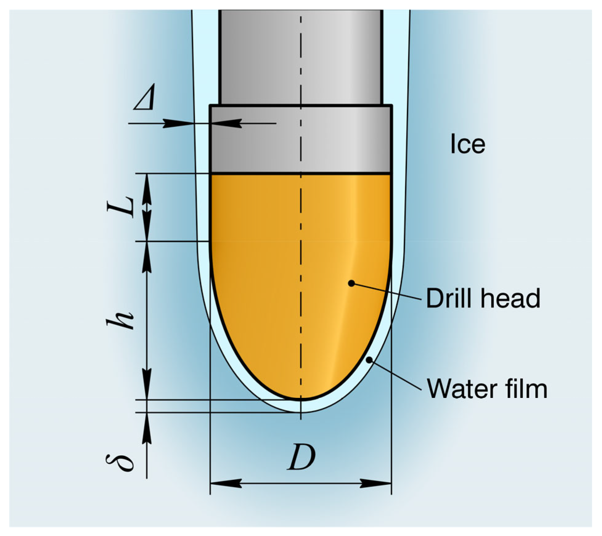 A thin meltwater film remains at the contact interface between the drill head and the borehole bottom. Its thickness δ is determined by the hydraulic resistance to water being squeezed out from beneath the drill head by the weight of the drill.