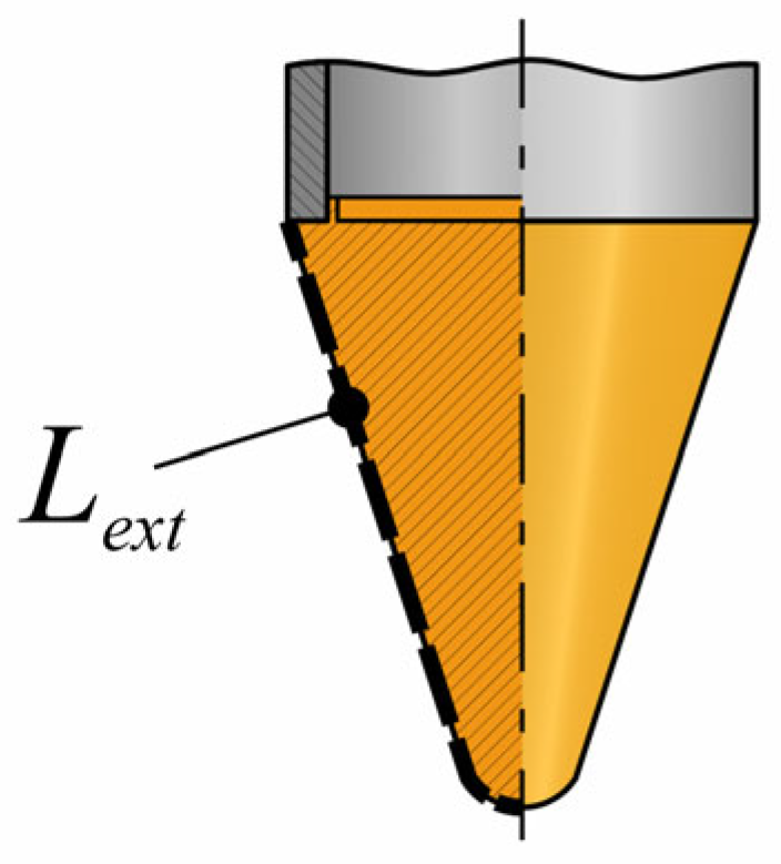 A shape approaching a full cone provides better self-centering and directional stability. The straight walls of a conical form facilitate relatively uniform heat distribution—though not perfectly so. The tip remains the most problematic area: if it becomes a cold spot, penetration slows; if it overheats, the low thermal mass makes it vulnerable to damage. Increasing the cone angle reduces thermal drilling efficiency and leads to higher heat losses, but it can also help minimize thermal disturbance in the surrounding ice [