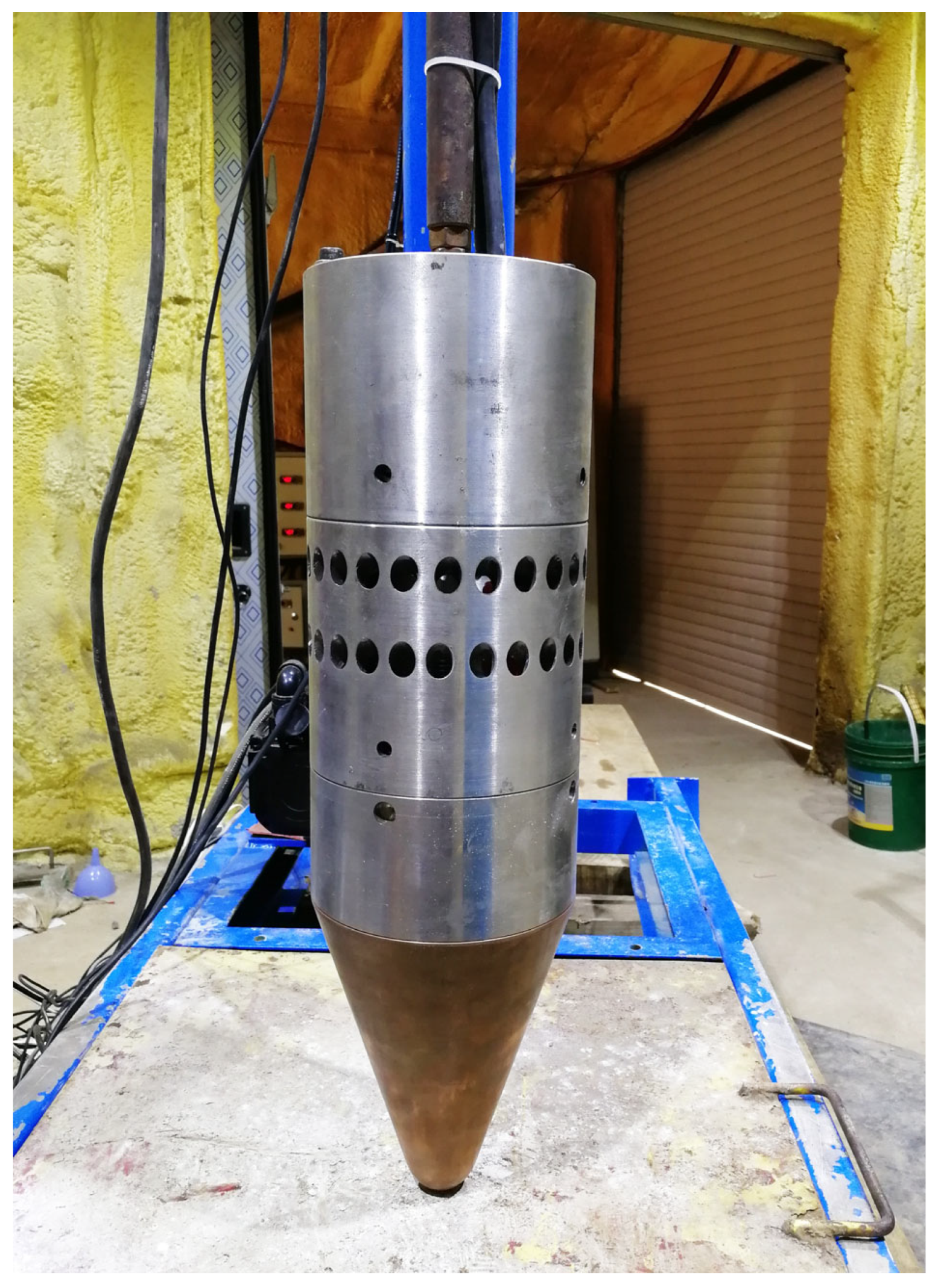 18]. The drill head had 16 cartridge heaters installed in the holes of the copper body. The cartridge heaters were of different lengths: eight longer heaters were inserted up to the bottom of the drill head to ensure that the tip reached the maximum temperature, while eight shorter heaters were used to provide more uniform heating of the upper section of the drill head. Together, these heaters provided a total power of approximately 5 kW. The drill head had a cone angle of 38°, a diameter of 160 mm, and a length of 200 mm.