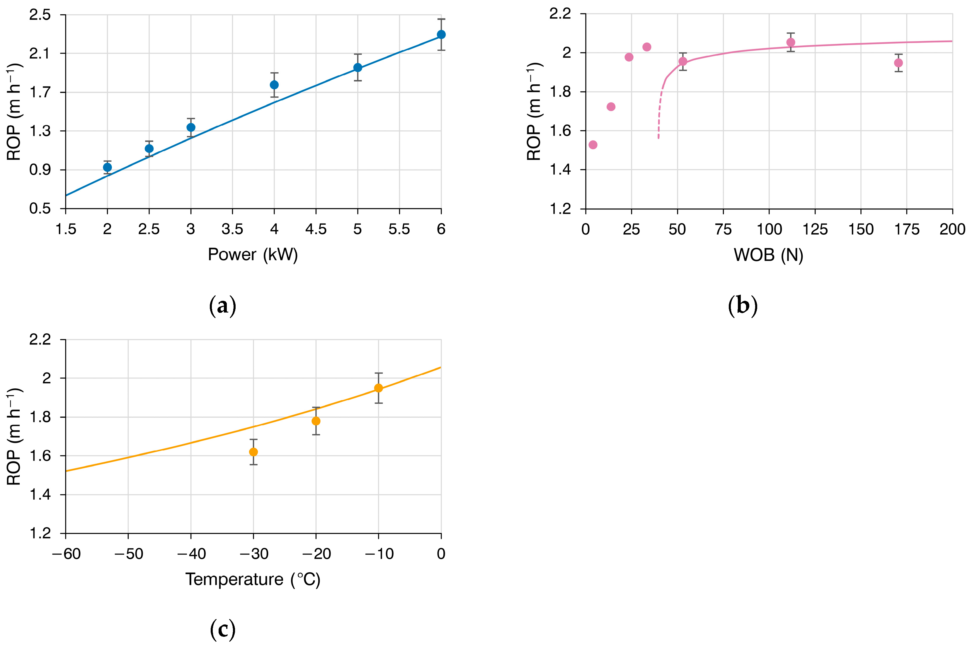 (c) shows the dependence of the ROP on the temperature of the ice at a constant power supplied to the drill head of 5 kW and a WOB of 53 N (ps = 2634.7 N m−2).