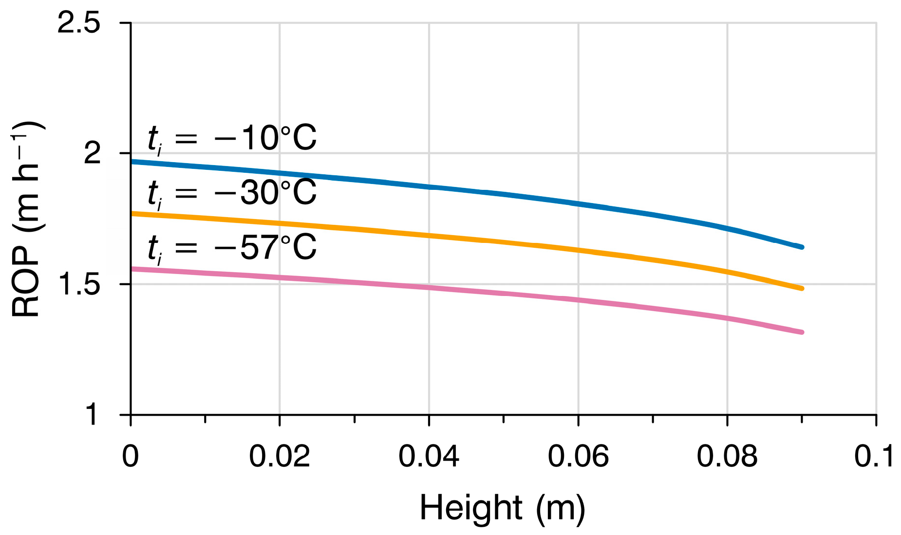 −2. If the meltwater boiling point is assumed to be 100 °C, the minimal required ROP at maximum power for efficient heat removal would be approximately 0.83 m h