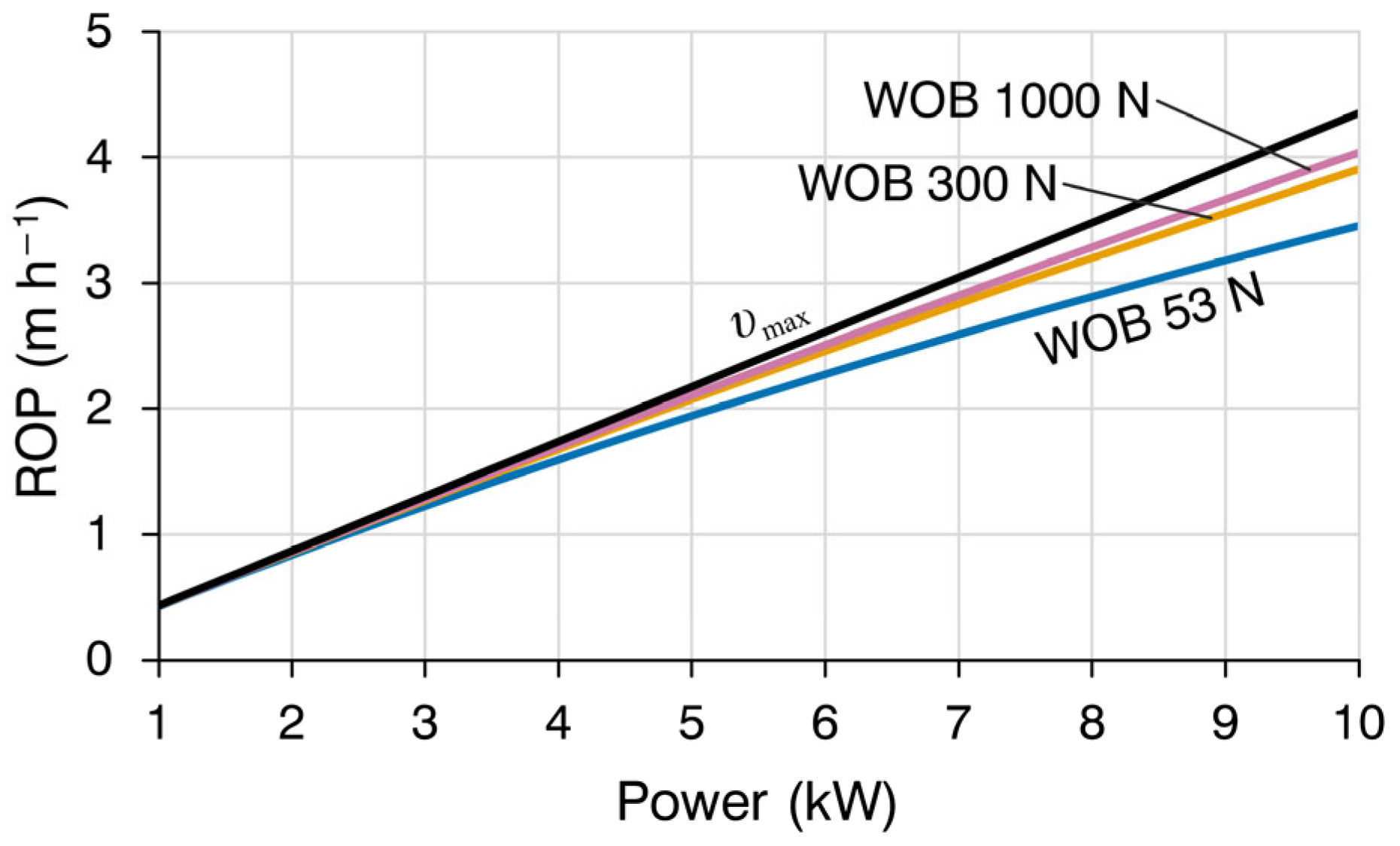 υmax represents the maximum theoretically achievable ROP, calculated from Equation (22), while