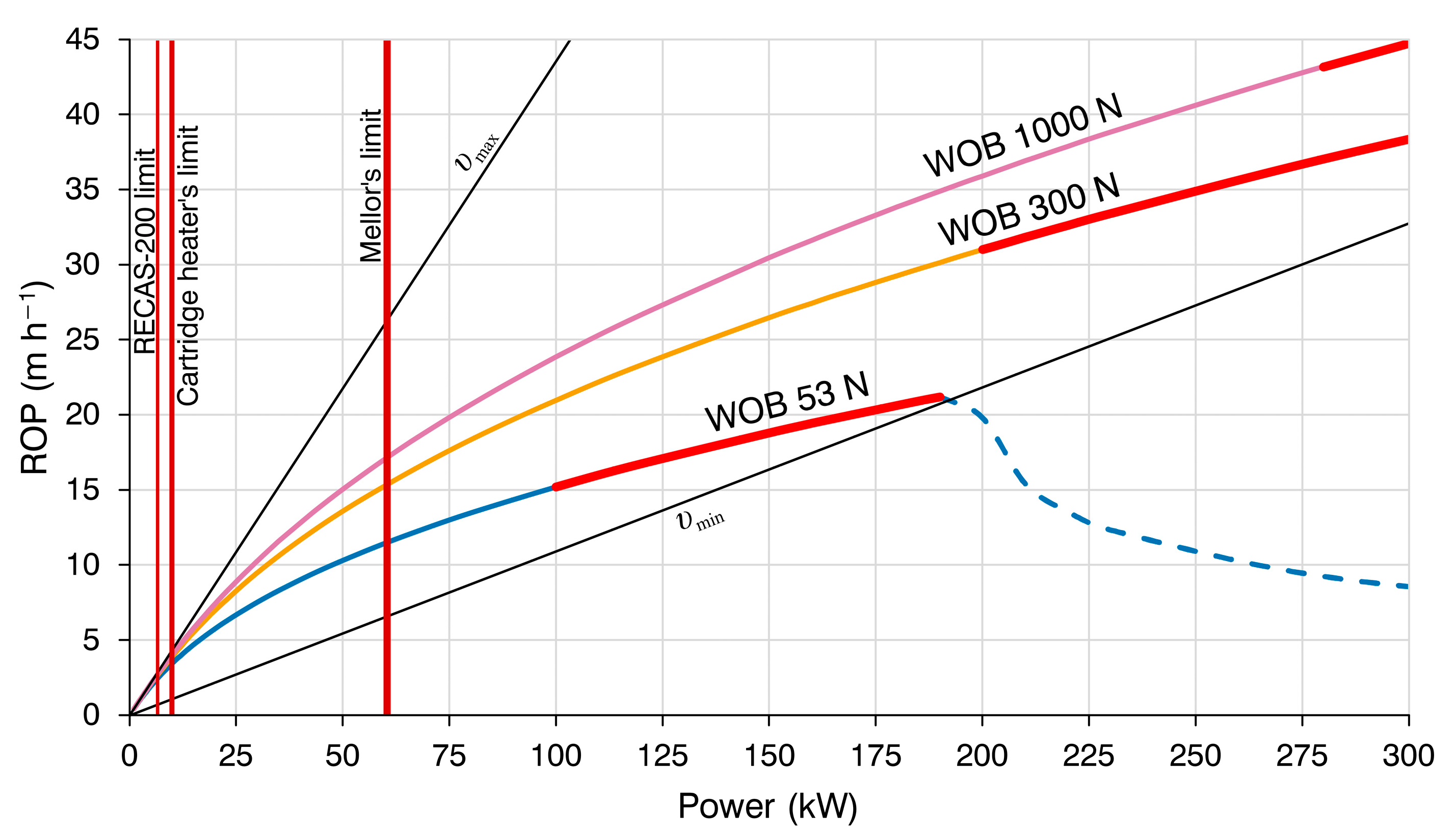 υmin shows the minimum required ROP (Equation (23)). For instance, RECAS-200’s drill head uses sixteen heaters rated at 7.6 kW in total. Assuming 80% efficiency and an active surface area of 0.063 m