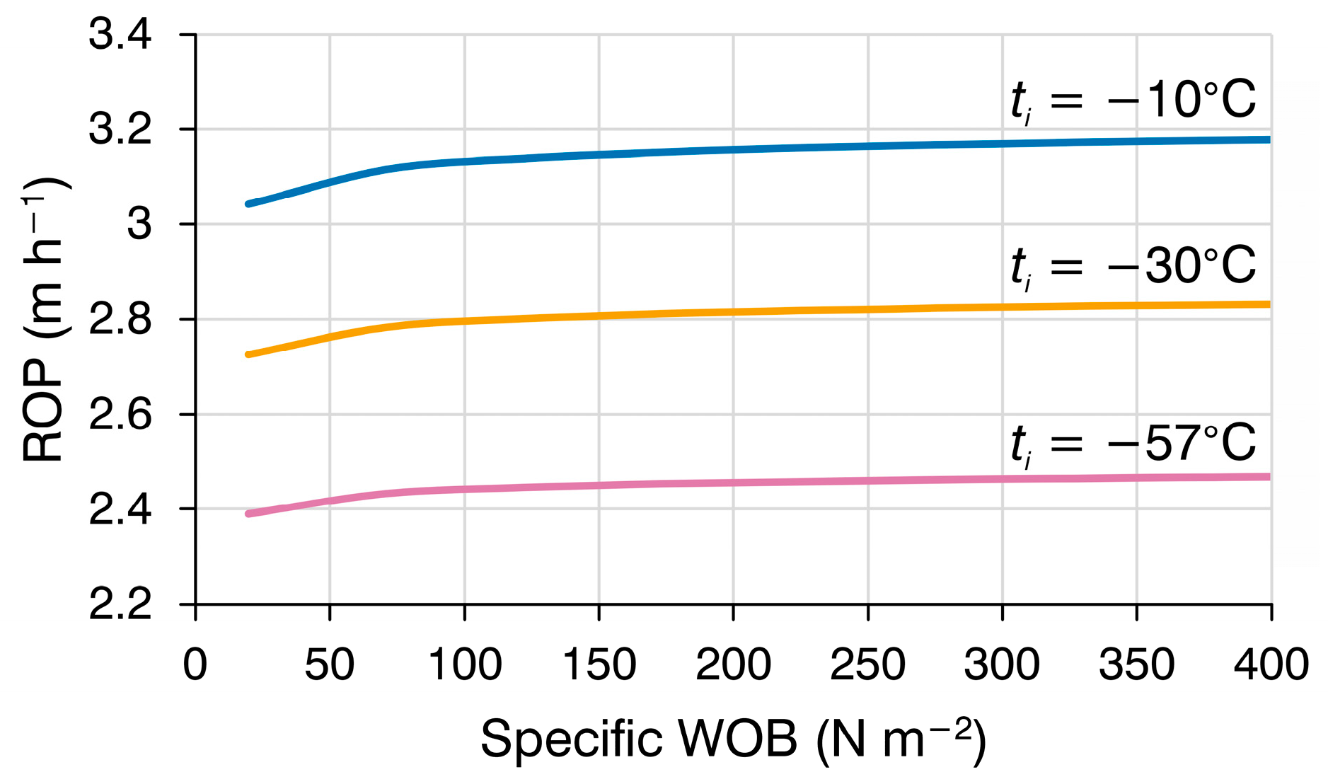 L at three different values of ice temperature and a constant WOB of 60 N.