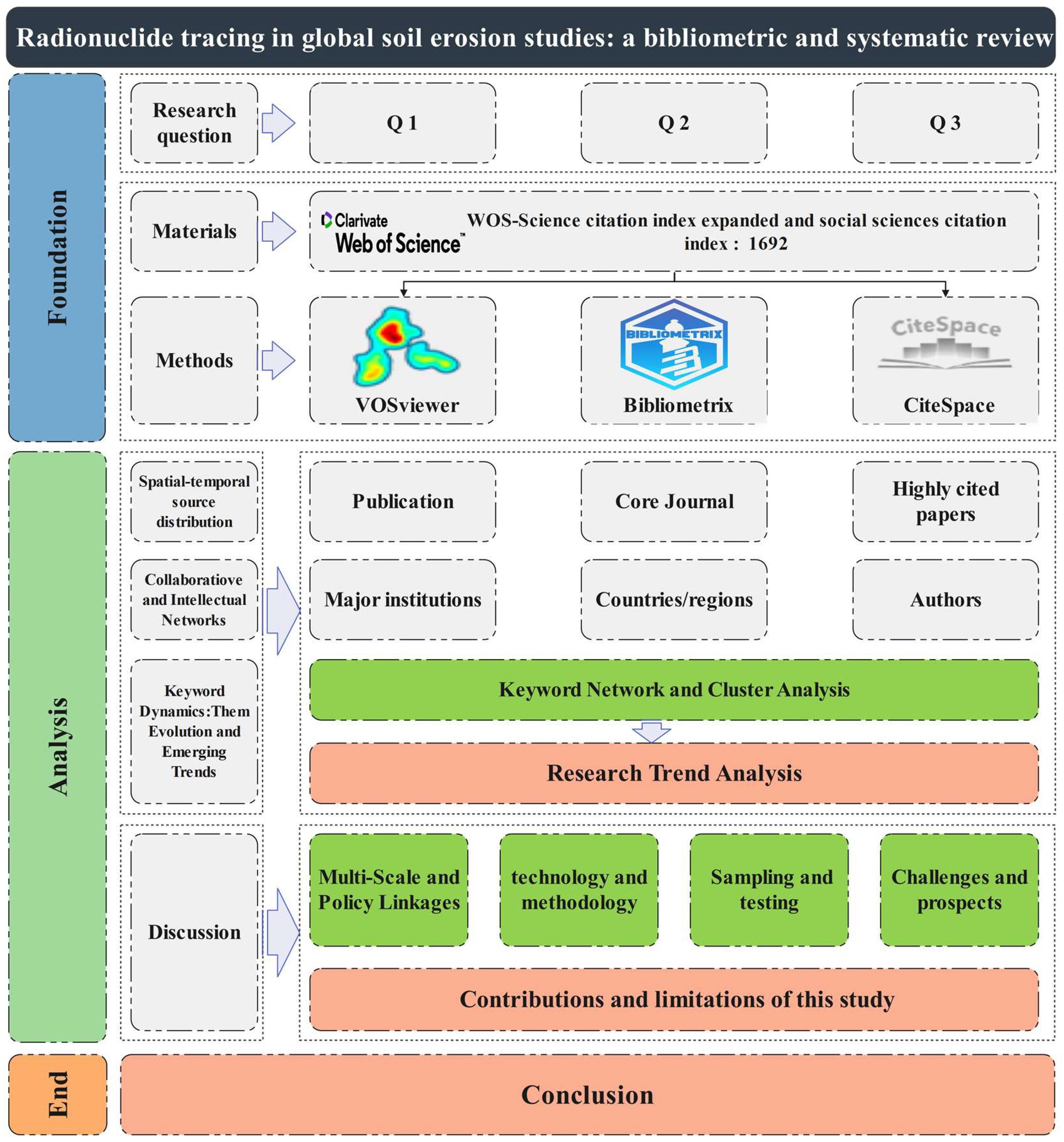 This Research | ✓ | WoS database (1692 relevant studies worldwide) | 2000–2023 | Bibliometrix + VOSviewer + CiteSpace | PageRank, betweenness centrality, H-index, G-index, M-index, MCP, SCP | (1) Citation metrics (H-index, G-index) are affected by update lags, potentially underestimating recent high-impact studies; (2) analysis is limited to English-language WoS Core Collection records, excluding non-English and gray literature | (1) Applied a Bibliometrix–VOSviewer–CiteSpace triad to achieve multi-level bibliometric analysis beyond single-tool reviews; (2) mapped global research patterns and linked traditional tracers with emerging methods to capture dynamic field evolution |
