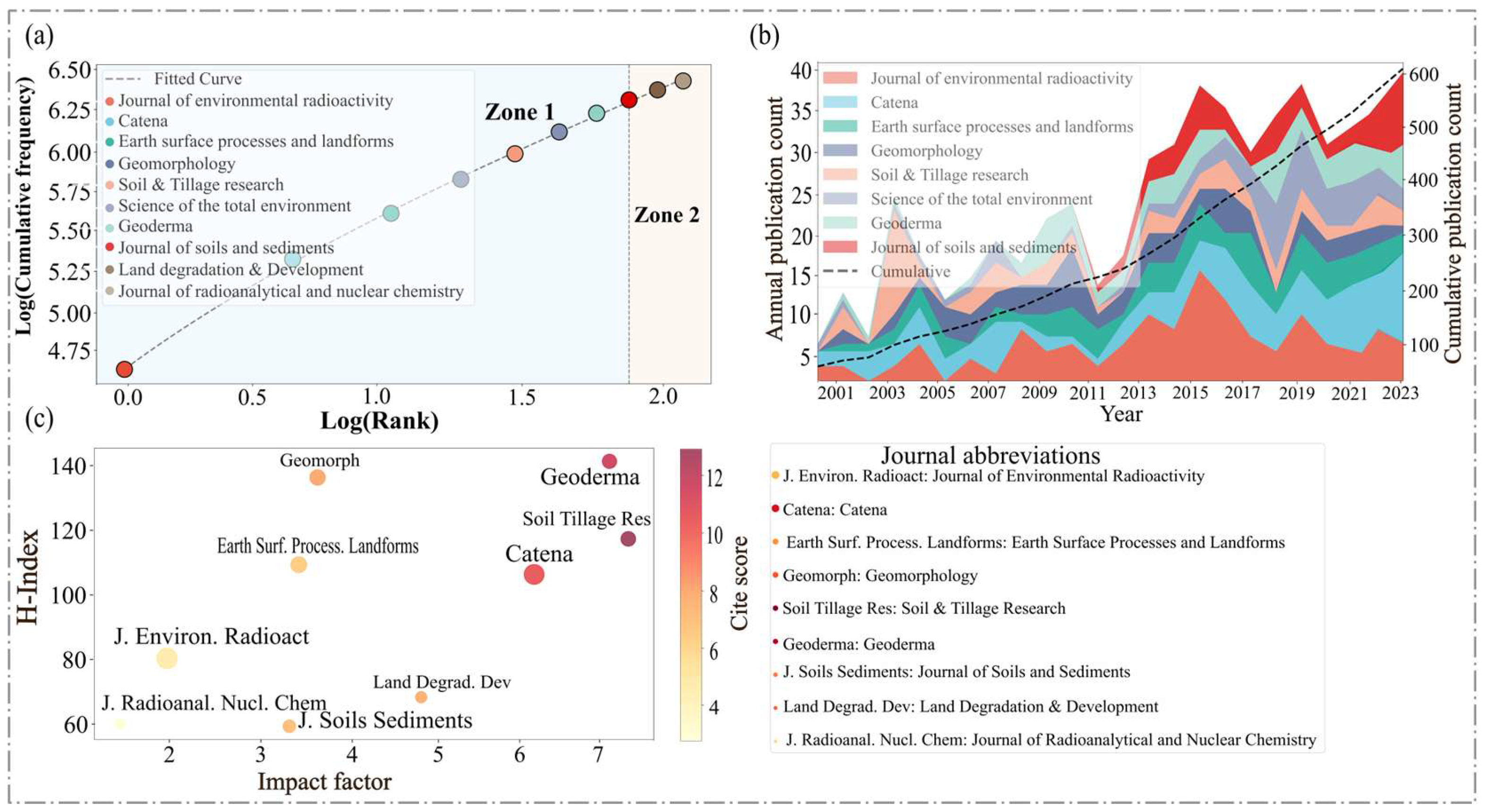 Comparative advantages and limitations of the fallout radionuclides 137Cs, 210Pbex and 7 Be for assessing soil erosion and sedimentation (Review) | 19.29 | 208 | 328 | 63.41 | [9] | Journal of Environmental Radioactivity |
