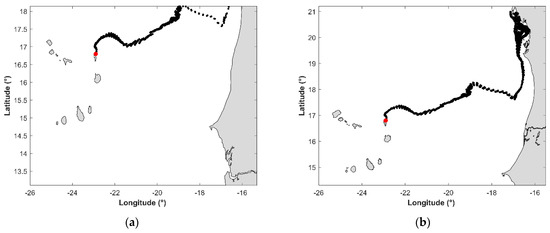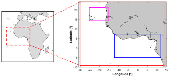 Given the large volume of particles and the associated computational demand, two different simulations were conducted, referred to as “Section 3.1 and Section 3.2”. The initial domain selected for “Section 3.1” (−26° W, −15° E; 13° S, 18° N) did not allow for the identification of the source coastal area, necessitating an expansion in “Section 3.2” (−26° W, −15° E; 14.5° S, 21° N).