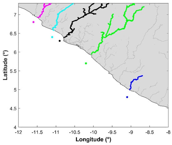 Study area. The discharging points are represented with different colours: the Mano (pink), Lofa (light blue), St. Paul (black), St. John (green), and Sinoe (blue) rivers.