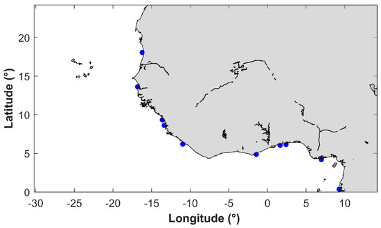 For each region, the river contributing the most to marine plastic litter was identified as the primary input source. These rivers were selected based on data from “River plastic emission to the World’s Ocen” [6], available on the OceanCleanUp website (https://theoceancleanup.com/sources/, accessed on 16 January 2022). The identified rivers included seasonal rivers (Mauritania) and the Sine-Saloum (Senegal), Gambia (Gambia), Rio Como (Guinea-Bissau), Konkourè (Guinea), Alligator (Sierra Leone), Mesurado (Liberia), Pra (Ghana), Lake Togo (Togo), Lake Nokouè (Benin), the Imò (Nigeria), and Michel Marine (Gabon). Given the high computational demand and the extensive area under analysis, one macroplastic particle was released daily from each river. The simulation was conducted during the rainy season, spanning from May to October (https://climateknowledgeportal.worldbank.org/, accessed on 2 September 2025).