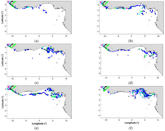 Particles’ position maps for the most representative months, 2021 (the first day of each month is shown). (a) February; (b) April; (c) June; (d) August; (e) October; (f) December. Points in maps have the same colours as their discharging rivers: Mano (pink), Lofa (light blue), St. Paul (black), St. John (green), Sinoe (blue).