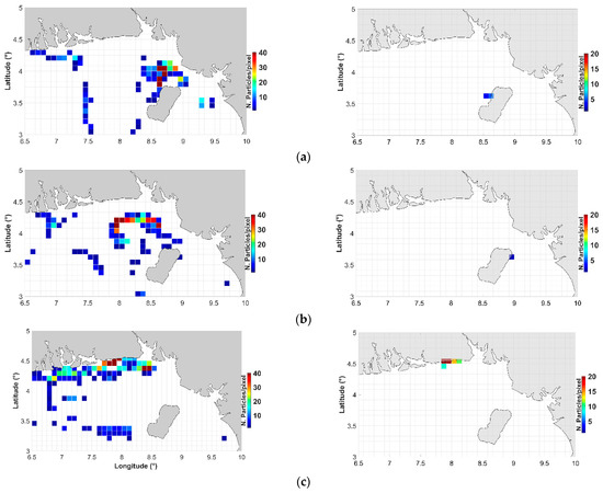 The significant impact on the Gulf of Guinea was further confirmed by the density maps, which allowed for the quantification of macroplastics within each pixel and clearly delineated the accumulation areas. Although density maps were generated for all simulation days, only those depicting the highest plastic concentrations are reported (Figure 6, left panel).
