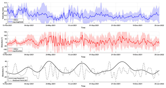 As the simulation was one year long, a trend analysis allowed us to check for possible influences of the WAM system on particle movements. Specifically, time series of the particles’ velocities and directions (and their averages) were computed. The average direction was further analyzed via a trend analysis to compute long-trend (LT) and seasonal-trend (ST) components, which were then qualitatively compared with the WAM system’s main characteristics (stages and periodicity).