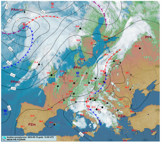 Synoptic analysis for 19 August 2024 at 12:00 UTC. Data source: Institute of Meteorology and Water Management—National Research Institute (IMGW-PIB).