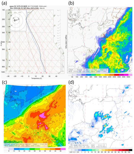 Distribution of selected meteorological parameters from the ALARO model run initialized at 00 UTC on 19 August 2024: (a) Forecast thermodynamic diagram for Warsaw (EPWA) valid for 18 UTC, illustrating atmospheric instability and vertical moisture structure; (b) Composite field of Convective Available Potential Energy (CAPE) and 0–6 km vertical wind shear (SHEAR), indicating zones of moderate instability and weak-to-moderate shear conducive to multicellular convection; (c) Total Precipitable Water (TPW), showing a deeply saturated troposphere over central Poland with local maxima exceeding 40 mm; (d) Simulated 3 h accumulated precipitation for the 15:00–18:00 UTC interval, highlighting a localized precipitation core near Warsaw. Data source: Institute of Meteorology and Water Management—National Research Institute (IMGW-PIB).