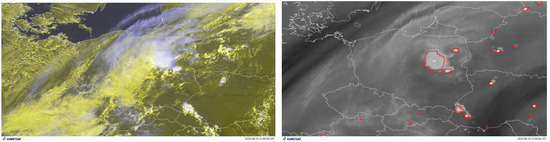 The data presented in this study are available in open-access repositories. Radar and meteorological data are accessible from the Polish Institute of Meteorology and Water Management (IMGW-PIB) at https://dane.imgw.pl (accessed on 19 July 2025), while numerical model outputs (ALARO) can be accessed upon request via the IMGW-PIB platform at https://www.imgw.pl (accessed on 19 July 2025) These datasets were derived from public domain resources, including the IMGW-PIB open data portal and the EUMETSAT Earth Observation Portal (https://eoportal.eumetsat.int, accessed on 19 July 2025).