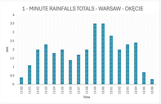 Around 13:55 local time (11:55 UTC), a rapidly intensifying multicellular convective system impacted the western districts of Warsaw. At the Warsaw-Okęcie station, 31.8 mm of rainfall was recorded in approximately 20 min (Figure 5). This corresponds to a first-degree torrential rainfall (α = 8.1) in the Chomicz classification. The spatial proximity of high-intensity rainfall cores suggests a localized but highly efficient precipitation process, typical of slow-moving convective clusters.